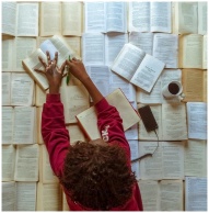 Aerial shot of a woman studying with books, coffee