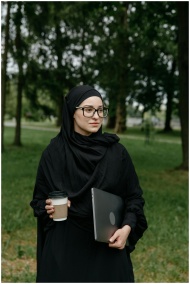 A young woman wearing a hijab and glasses holds a coffee cup and laptop in a serene park setting.