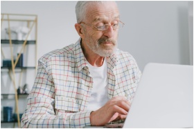 Senior man with eyeglasses working on a laptop in