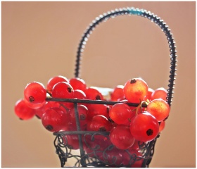 Close-up of juicy redcurrants in a decorative basket, highlighting vibrant colors and healthy nutrition.