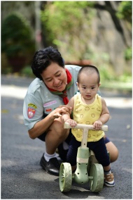 Child riding a tricycle supported by an adult in a