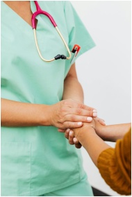 A nurse in green scrubs gently clasps a patient's