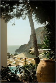 Relaxing Mediterranean resort view in Capri, Italy, featuring deckchairs and sunshades by a pool, ideal for travel and leisure seekers.