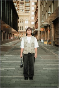 Stylish young adult posing confidently in a modern urban street setting.