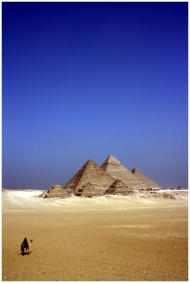 Stunning view of the Pyramids of Giza with a lone figure and camel under a clear blue sky.