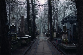 A misty winter morning in an old cemetery with tombstones and leafless trees lining the path.
