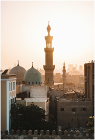A stunning view of mosque minarets at sunset in Cairo, highlighting cultural architecture.