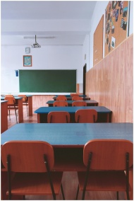 A tranquil empty classroom with wooden furniture a