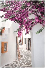 Picturesque Greek walkway adorned with vibrant bou