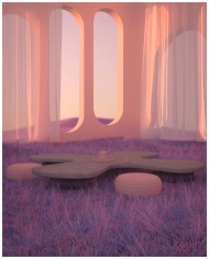 Ethereal 3D-rendered room with futuristic design and pastel hues, capturing a calm and serene atmosphere.