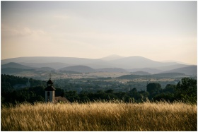 Tranquil landscape of Kamienna Góra, Poland, featuring lush fields, hills, and a distant church under a sunset sky.