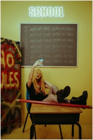 Teenage girl taking a selfie in classroom, defying rules scrawled on blackboard.