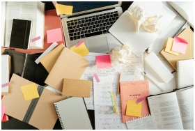 Flatlay of a messy study desk with laptop, noteboo
