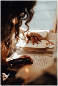 Crop anonymous female with dark hair sitting near window at retro writing cabinet while taking notes with feather in vintage store