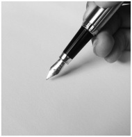 A close-up of a fountain pen writing on blank paper in black and white, capturing elegance.