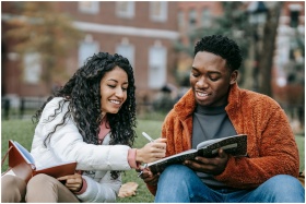 Happy college students studying together on a campus lawn, sharing ideas and writing notes.