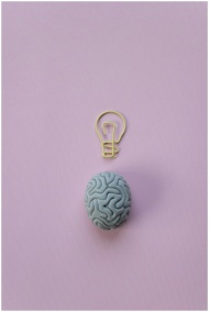 Brain-shaped eraser with a light bulb paperclip on a pastel pink background. Ideal for education and creativity themes.