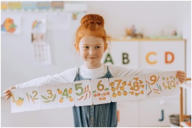 Young girl showcasing number cards in a vibrant cl