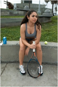 Woman in activewear seated on concrete with tennis