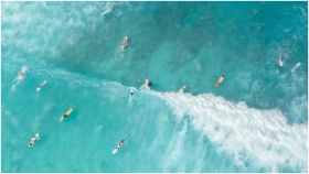A group of surfers navigates crystal clear turquoise waves from an aerial perspective.