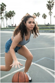 Young woman dribbling on an outdoor basketball cou