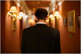 Rear view of man in black suit walking down a warmly lit hotel corridor.