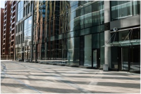 Empty cityscape featuring modern glass architecture and urban reflections.