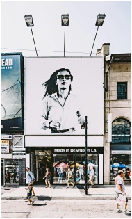 Busy Toronto street with shops, people, and large advertisement in urban setting.