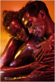 A captivating shot of two models embracing with glittery body paint under warm lighting.