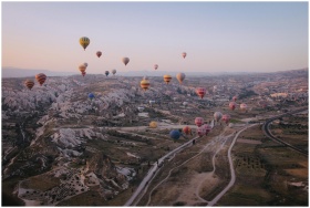 Hot air balloons floating over Cappadocia's unique landscape at sunrise.