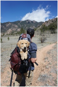 Adventure hike with a puppy in a backpack on a scenic mountain trail.