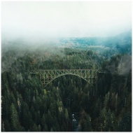 Stunning aerial shot of a bridge spanning a misty forest, showcasing nature's beauty.