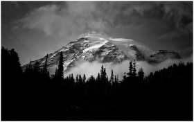 Majestic black and white landscape of Mount Rainier surrounded by fog and trees.