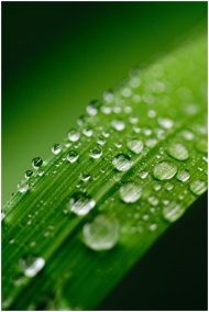 Close-up view of dewdrops on a vibrant green leaf,