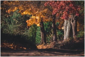 A tranquil autumn scene with vibrant colored leaves on trees in a forest path.