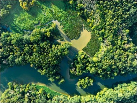 Stunning aerial view of a lush green forest surrounding a winding river in Chattanooga, Tennessee.