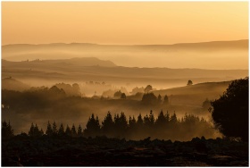 Misty sunrise over a serene valley with trees and rolling hills, creating a tranquil scene.