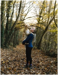 A woman holding her dog amidst a colorful fall for