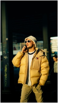 Trendy young man in yellow jacket and sunglasses talking on phone outdoors.