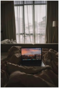 A laptop on a plush bed by the window in a cozy bedroom setting.