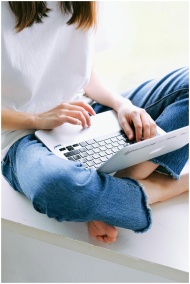 Woman sitting cross-legged in casual jeans working on a laptop indoors.