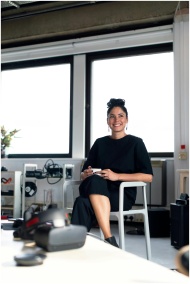 Confident young professional woman enjoying a coffee break in a modern office environment.
