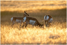 Three pronghorns graze in a sunlit meadow, capturi