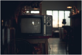 A classic CRT television in a dimly lit vintage room in Ho Chi Minh City, Vietnam.