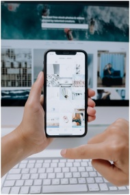 Person using smartphone to browse photos, office desktop setup.