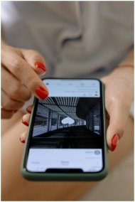 A woman with red nails uses a smartphone to browse social media indoors.