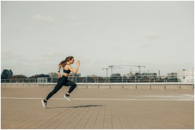 Woman sprinting on a rooftop in athletic wear during the day.