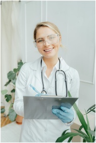 Confident female doctor with clipboard in a bright