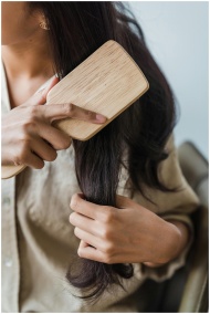 Close-up of a woman brushing her long dark hair with a wooden brush indoors.