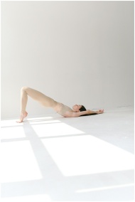 Full-length shot of a woman striking a bridge pose in a sunlit studio, emphasizing fitness and tranquility.